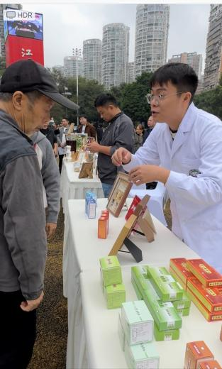 江陽公園里的“煙火氣”中融入了“草藥香”。在一個(gè)鋪滿中藥標(biāo)本、飲片的“攤位”前,市民卓女士拿起一味中藥材看了看,“這是藿香?薄荷?”二者形狀有些相似,她不確定,便用手指碾碎后放至鼻間聞了聞,才給出肯定答案,“是薄荷,有清涼的味道?!薄皵偽弧鼻?,市民爭相排隊(duì)答題互動(dòng),辨認(rèn)中藥材贏獎(jiǎng)品。