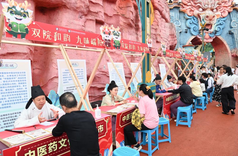 看義診做艾灸、識(shí)中藥猜謎語(yǔ)、喝酸梅湯打八段錦……5月31日下午6時(shí)許,瀘州山河明月·醉酒城人頭攢動(dòng),熱鬧非凡。當(dāng)天,瀘州市中醫(yī)醫(yī)院聯(lián)合納溪區(qū)中醫(yī)醫(yī)院的醫(yī)護(hù)人員,在景區(qū)支起了“攤位”,一場(chǎng)以“雙院和韻·九味端陽(yáng)”為主題的“中醫(yī)藥文化養(yǎng)生集市”活動(dòng),就此拉開(kāi)序幕。